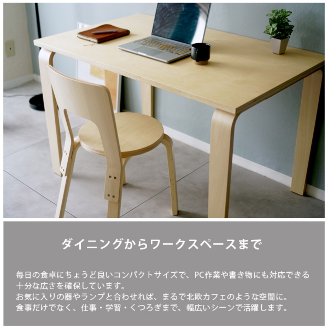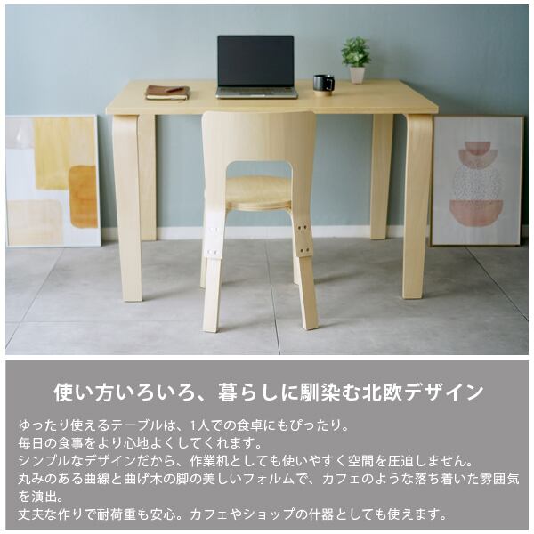 チェアは耐荷重約100kgでしっかり丈夫。曲げ木のやわらかなラインが北欧らしい雰囲気を添えます。