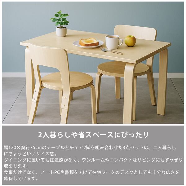 120×75cmのテーブルとチェア2脚のセットは、限られた空間でも使いやすいサイズ感。