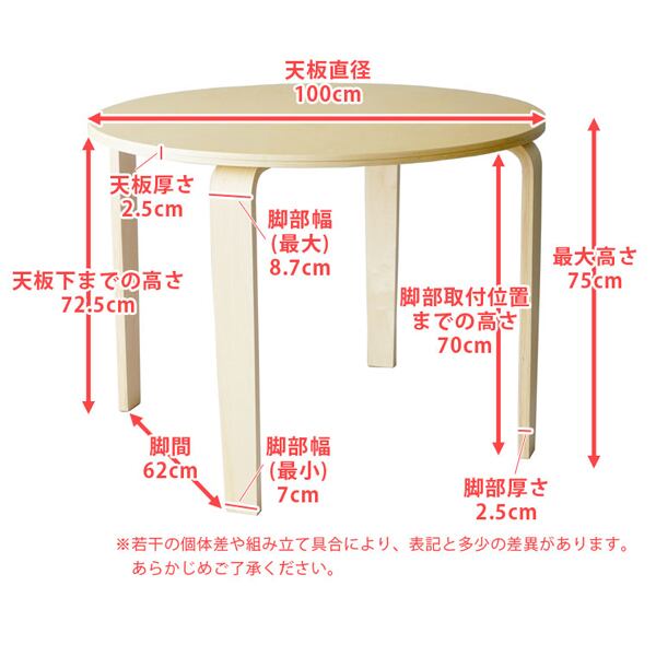 曲げ木で仕上げた頑丈な脚部、耐荷重約50kgのメラミン天板はキズや汚れに強くお手入れ簡単。