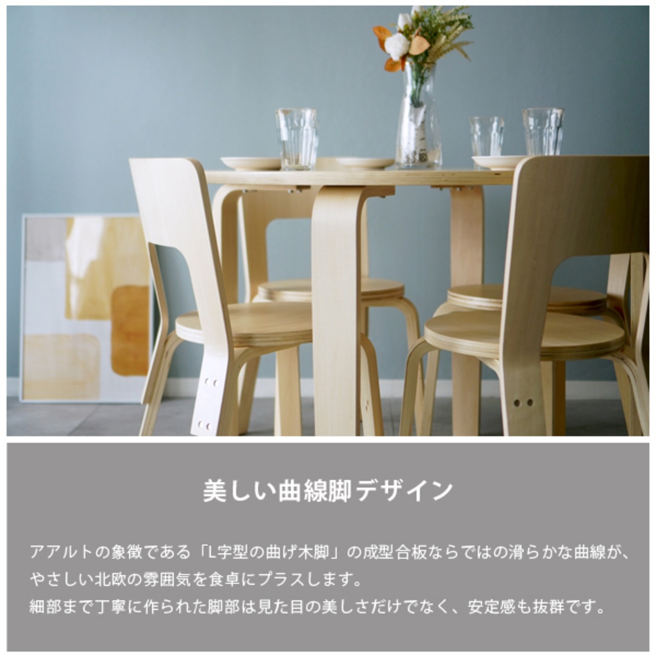 アアルトの象徴「L字型の曲げ木脚」が北欧デザインらしいやさしさを演出。
