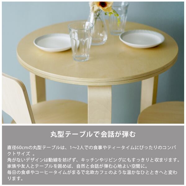 1~2人に最適な円卓サイズで、暮らしに自然と溶け込む北欧ナチュラルな空間を演出します。