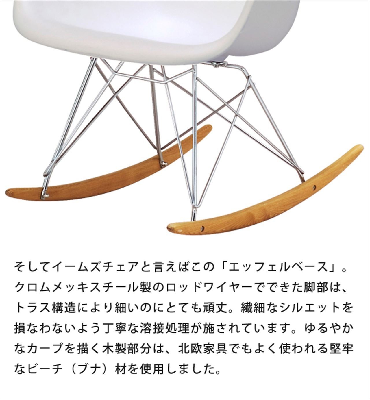 そしてイームズチェアと言えばこの「エッフェルベース」。クロムメッキスチール製のロッドワイヤーでできた脚部は、トラス構造により細いのにとても頑丈。繊細なシルエットを損なわないよう丁寧な溶接処理が施されています。ゆるやかなカーブを描く木製部分は、北欧家具でもよく使われる堅牢なビーチ(ブナ)材を使用しました。
