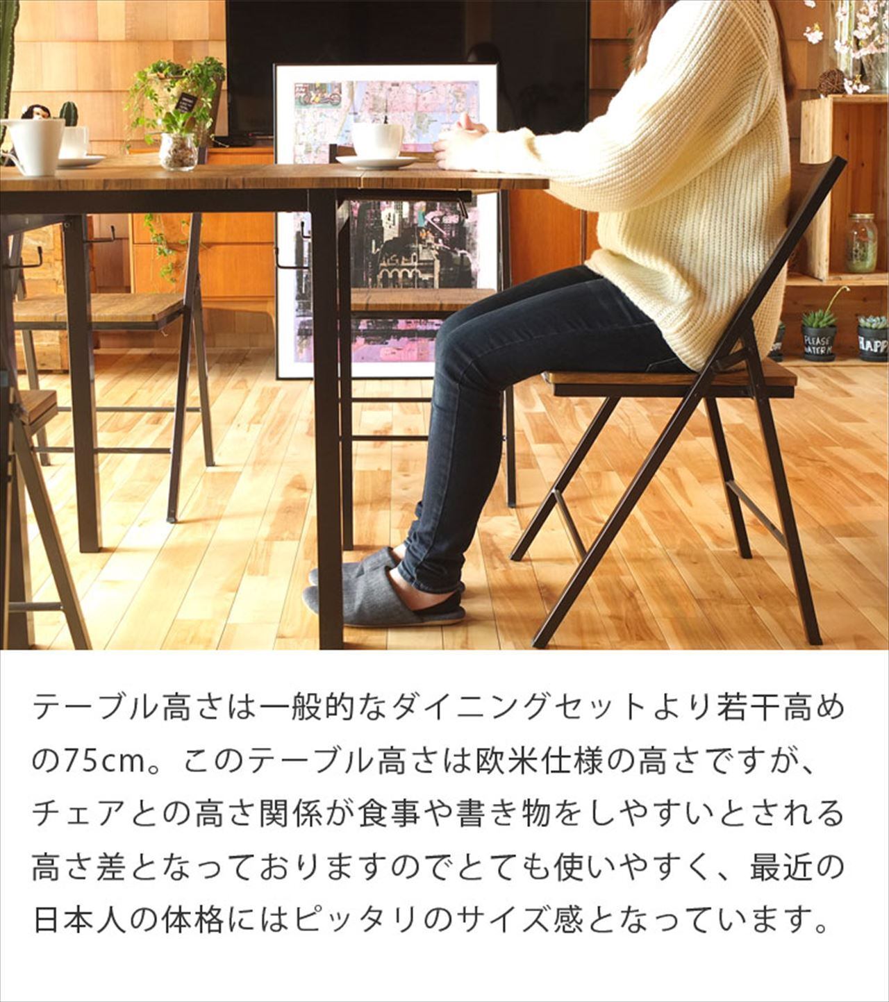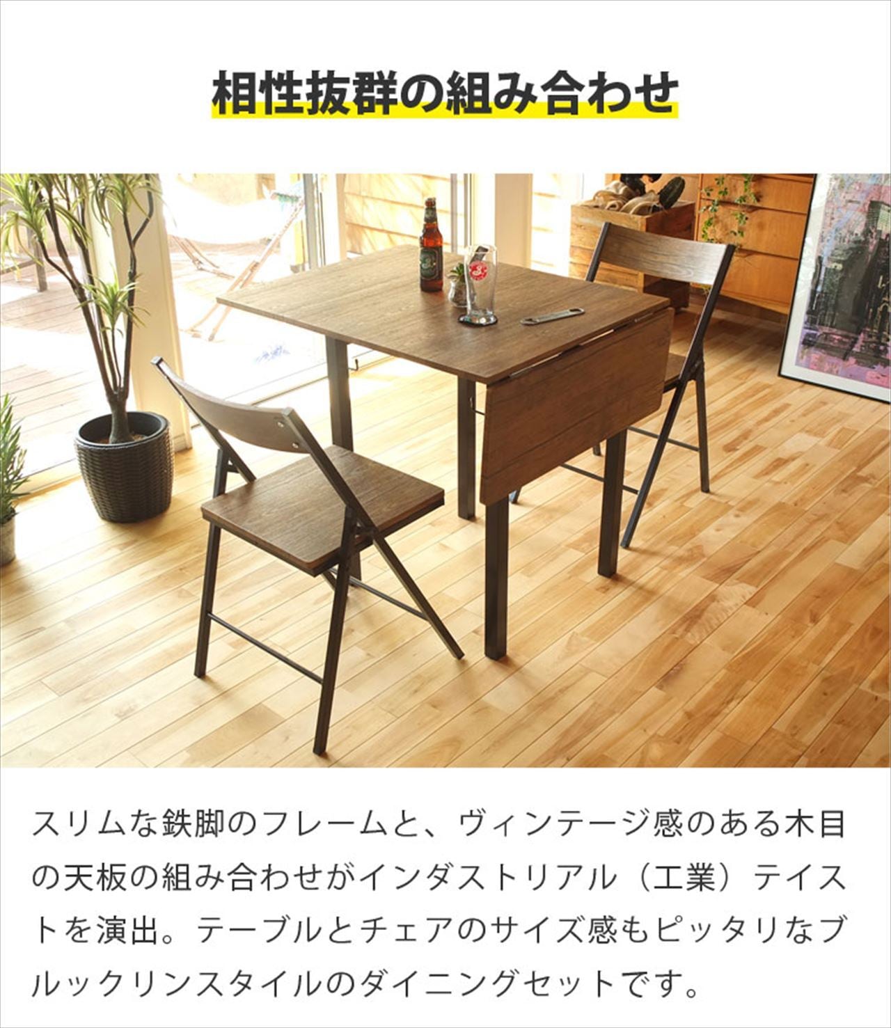 伸長式ダイニングテーブルと折りたたみチェアをお得なセットにました。どちらもインダストリアルなテイストで相性は抜群です。