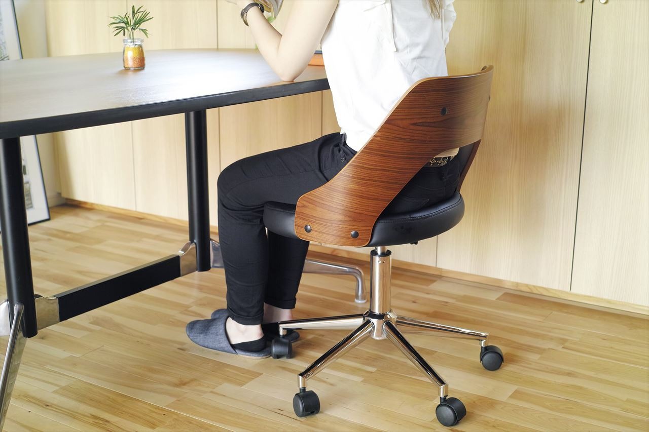 天然木の突き板仕上げの合板と、クロムメッキの脚部の組み合わせが高級感あふれるスマートなデザインです。シンプルながら入念に設計された背もたれの角度と、座面と背の当たる部分に配置されたクッションで座り心地は文句なし。デスクワークをしっかりサポートします。
