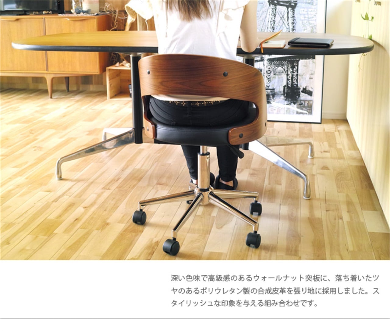 天然木の突き板仕上げの合板と、クロムメッキの脚部の組み合わせが高級感あふれるスマートなデザインです。シンプルながら入念に設計された背もたれの角度と、座面と背の当たる部分に配置されたクッションで座り心地は文句なし。デスクワークをしっかりサポートします。