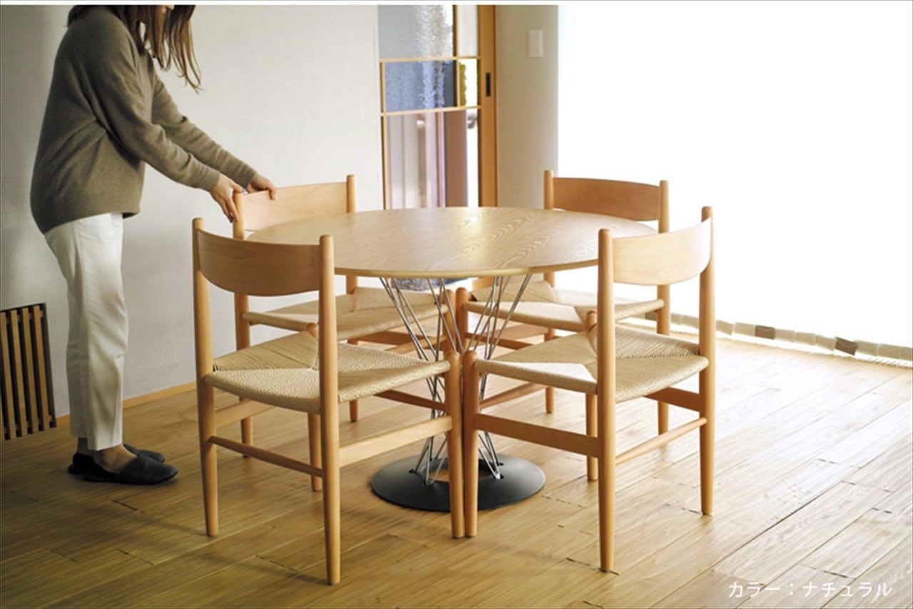 シンプルで直線的なラインは、複数並べた時にもすっきりとした印象を保てます。スタンダードな四角いテーブルはもちろん、このように円テーブルに合わせても意外ときれいにまとまるのです。当店お勧めのダイニングセットもぜひご検討ください。