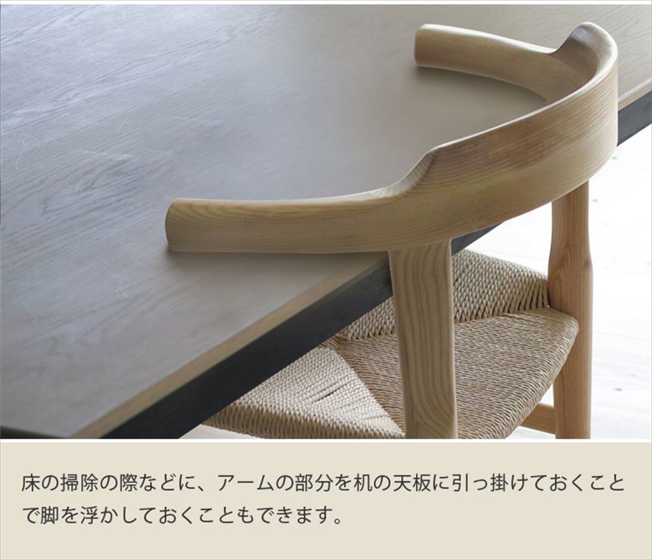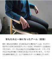 笠木(背もたれの部分)から流れるように繋がるアームは、ウェグナー のデザインに多くみられるディティールです。PP68のアームは短めにできており、テーブルに向かうときは邪魔にならず、リラックスするときは手を置いて休められるようにできています。「いろいろな姿勢を想定して」という目的をスマートに解決しています。