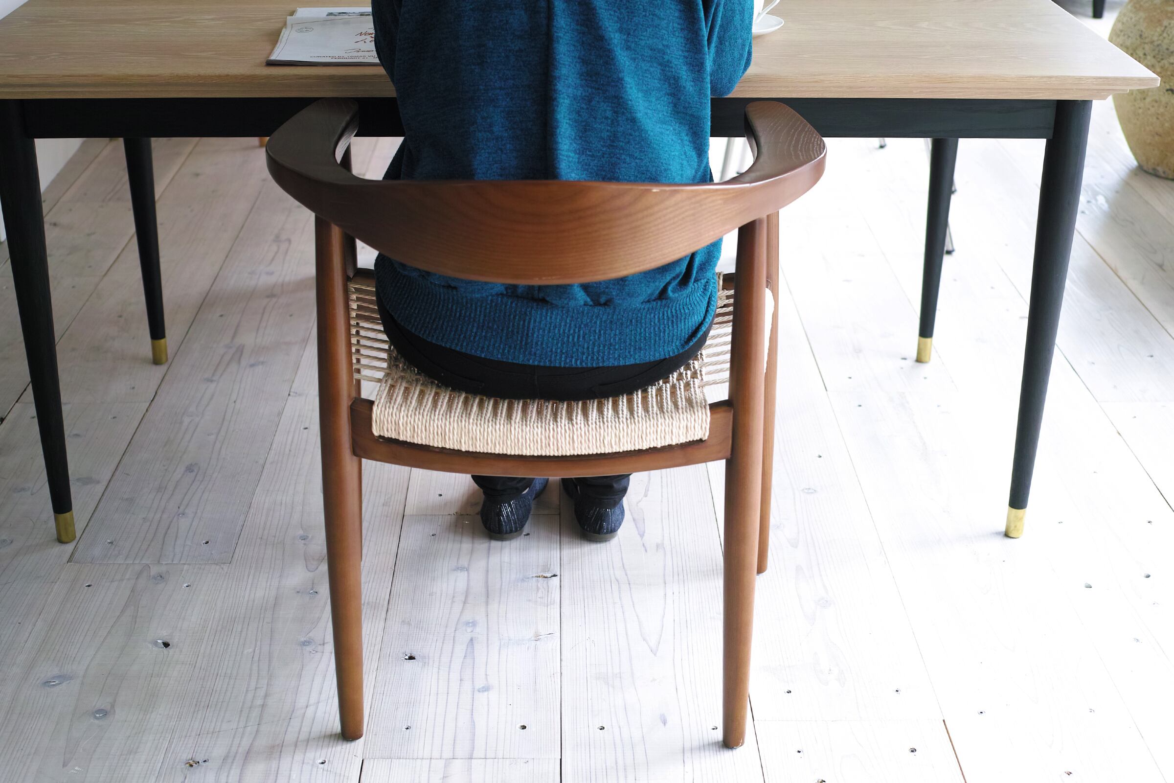 当初この継ぎ目は直角になっていて、美しくないという理由で隠されていました。のちにフィンガージョイントと呼ばれるギザギザの継ぎ目に改良され、デザインの一部としてあえて「見せる」継ぎ目が生まれました。機能性と美観を両立させるウェグナーの哲学が現れている箇所です。