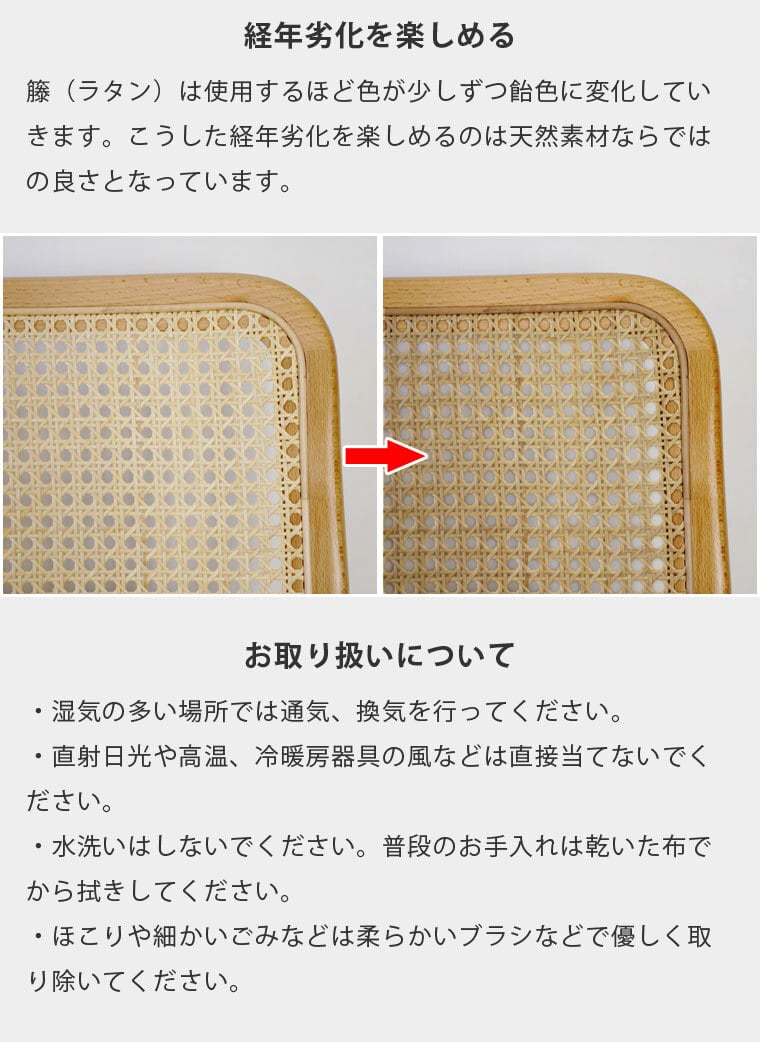 ※座面、背もたれ部分は天然素材(ラタン・木材)を使用しているため、1点1点に色の相違や黒ずみ、割れや剥がれ、節や繋ぎ目などが入る場合がございます。