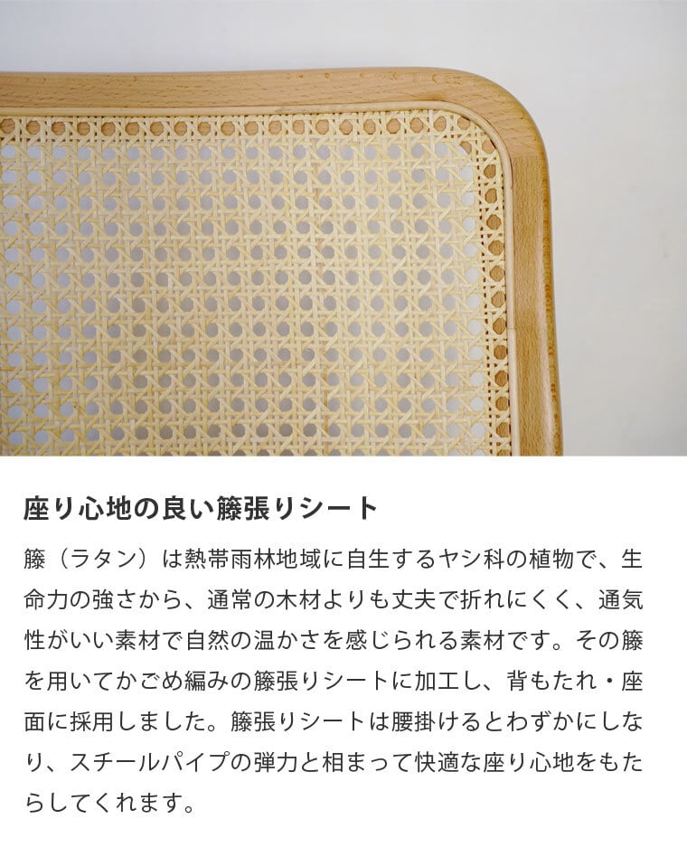 スチールパイプの無機質な素材と籐・木材の有機質な素材は正反対の性質と印象を持っていますが、フレーム部分に籐と相性のいいドイツ産のブナ材を採用したことでバランスがとれたモダンなデザインを実現しました。