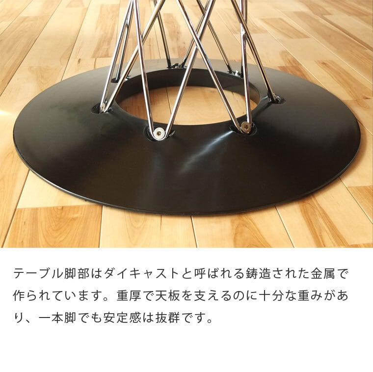 直径110cmというサイズの丸テーブルは、自然と視界を占める割合も大きくなります。その点において突板の木目は周囲になじみやすく、お部屋に合わせやすいといえます。