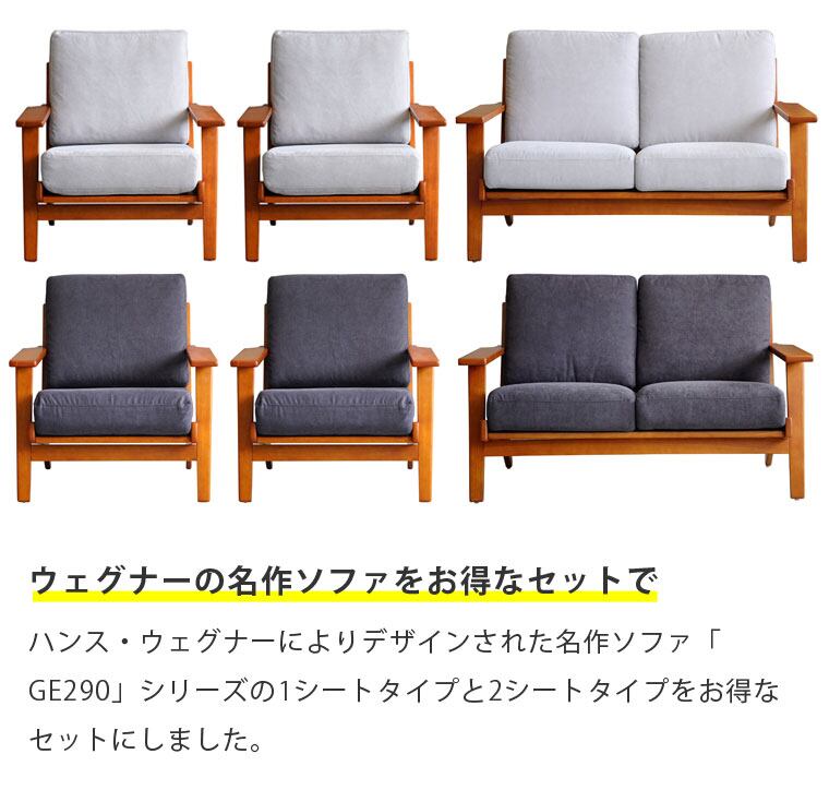 ハンス・ウェグナーによりデザインされた名作ソファ「GE290」シリーズの1シートタイプと2シートタイプをお得なセットにしました。