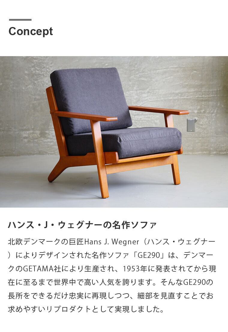 北欧デンマークの巨匠Hans J. Wegner(ハンス・ウェグナー)によりデザインされた名作ソファ「GE290」は、デンマークのGETAMA社により生産され、1953年に発表されてから現在に至るまで世界中で高い人気を誇ります。そんなGE290の長所をできるだけ忠実に再現しつつ、細部を見直すことでお求めやすいリプロダクトとして実現しました。